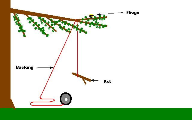 In Benutzung und dann passiert bei einem Rückschwung das was nicht passieren darf. Die Baumforelle hat gnadenlos zugepackt und unsere Fliege hängt in mehreren Metern Höhe im Astwerk fest. Es hilft kein Rütteln und kein Ziehen, die Fliege ist unerreichbar und offenbar verloren. Irgendwann bei dem Versuch die Fliege zu lösen reißt dann das Vorfach. So erging es mir unlängst auch. Nun war guter Rat teuer. Nach kurzer Überlegung entsann ich mich einer Rolle mit den Resten vom neuen 20 lbs - Backing, das ich bei mir hatte. So um die 10 Meter waren da sicher noch drauf. Da müsste doch noch was zu machen sein. Ich knotete also einen geeigneten Stock als Gewicht an das Backing, rollte die erforderliche Länge ab und warf diesen über den Ast, wo sich meine Fliege verhakt hatte. Nach einigen Versuchen klappte das dann. Durch das Eigengewicht und Newton sei dank zog der erdwärts gleitende Stock das Backing in greifbare Nähe. Nun lag das Backing über dem entsprechenden Ast und beide Enden waren greifbar. Ich musste nun nur noch eine Schlaufe binden und konnte dann durch Zug den entsprechenden Ast sicher zu mir herunter ziehen (Achtung Backing schneidet sich gerne bei entsprechendem Zug in die Haut ein). Der Rest war eine Kleinigkeit. Ich löste die Fliege und Schnitt das Backing durch. Der Ast schnellte in die Höhe und meine Fliege hatte ich wieder.