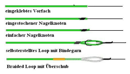 Es gibt mehrere Möglichkeiten das Vorfach mit der Hauptschnur zu verbinden. Zum einen kann man mit einer Nadel das Vorfach in die Schnurseele ziehen und dieses mit Hilfe von Klebstoff verkleben (sehr diffizile Prozedur). Eine weitere Variante ist die Sicherung des durchgezogenen Vorfaches mit einem Nagelknoten (eingestochener Nagelknoten). Traditionell kann der Nagelknoten auch ohne das das Vorfach durch die Seele der Flugschnur geführt wird verwendet werden. Als weitere Möglichkeiten seien diverse Schlaufenverbindungen genannt. Zum einen gibt es Hersteller die von Haus aus am Ende der Flugleine eine Schlaufe vorsehen (z.B. Orvis) und zum anderen kann man eine solche Schlaufenverbindung selbst herstellen, indem man mit dem Ende der Flugschnur eine Schlaufe bildet, diese verklebt und mit Bindegarn umwickelt. Zum Schluß wird das Bindegarn noch mit Rutenlack lackiert. Die einfachste und modernste Variante eine Schlaufe für das Anknüpfen eines Vorfaches an die Flugschnur zu bekommen ist die Verwendung von sogenannten Braided Loops. Diese Geflechtsschläuche mit vorgefertigter Schlaufe werden über das Ende der Hauptschnur geschoben und arbeiten nach dem Klammerprinzip. Je stärker der Zug, desto fester zieht sich der Schlauch um die Flugschnur. Das Ende des Schlauches wird mit einem Überschub gegen das Ausriffeln des Geflechtes gesichert. Um das Vorfachende mit der Schlaufe an der Fliegenschnur zu verbinden kann man eine weitere Schlaufe (mit Chirugenknoten erstellt) verwenden oder man knüpft das Vorfach mit einem Clinchknoten an.